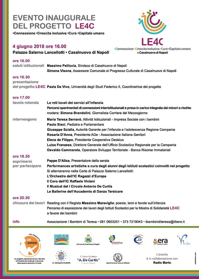 Lorenzo Insigne in campo per la solidarietà. Video-messaggio per LE4C Lunedì a Casalnuovo arriva la maglia numero 24 dello scugnizzo partenopeo (Evento in programma a Palazzo Lancellotti, ore 16) Supporter d’eccezione per il progetto “Le4c – Connessione – Crescita inclusiva – Cura – Capitale Umano, che prenderà il via lunedì alle 16 a Palazzo Lancellotti di Casalnuovo con una tavola rotonda. L’attaccante, uomo simbolo del Napoli, Lorenzo Insigne ha donato una maglia e inviato un breve video messaggio di saluto. “Ringraziamo Lorenzo Insigne per il supporto – spiega la coordinatrice del progetto Paola De Vivo – che si conferma un campione anche fuori dal campo. Con il suo gesto ha donato un momento di gioia immensa ai nostri bambini. Speriamo di poterlo avere presto tra noi”. Il progetto, realizzato grazie ai fondi della Fondazione Con il Sud, coinvolgerà 1200 bambini, 400 genitori e 50 insegnanti in varie attività che spazieranno da quelle ludiche a quelle di formazione. L’iniziativa nasce dalla sinergia tra l’associazione capofila ‘I Bambini di Teresa Onlus’ e l’amministrazione comunale di Casalnuovo , tre istituti scolastici, due cooperative sociali, due associazioni e il Dipartimento di Scienze politiche dell’Università Federico II di Napoli. Alla tavola rotonda, il cui inizio è previsto alle 16 con i saluti del sindaco Massimo Pelliccia e dell’assessore Simona Visone, parteciperanno, la docente universitaria Paola De Vivo che introdurrà l’iniziativa; Maria Teresa Serranò, Impresa sociale con i bambini; Paolo Siani, pediatra e Deputato; Giuseppe Scialla, Garante regionale per l’infanzia e l’adolesenza; Rosaria D’Anna, presidente Associazione Italiana Genitori; Elena De Filippo, presidente cooperativa Dedalus; Luisa Franzese, Direttrice dell’Ufficio scolastico regionale per la Campania; Osvaldo Cammarota, Operatore Sviluppo Territoriale – Banca Risorse Immateriali. Tra gli altri partner della Rete a supporto del progetto LE4C ci sono i dirigenti scolastici Nicola Borrelli del “I Circolo De Curtis”, Claudio Mola de “I Ragazzi D’Europa”, Luisa De Simone dell’istituto “Viviani”, Giacomo Smarazzo della cooperativa Era e Gaetano Amorico dell’Associazione Diabetici Junior.