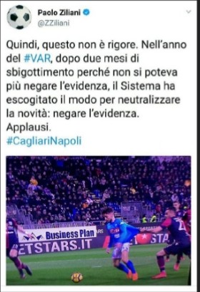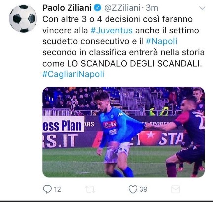 L’ex Napoli Paolo Ziliani, tramite il proprio profilo Twitter, ha commentato duramente l’episodio della trattenuta su Mertens: “Quindi questo non è rigore, nell’anno del Var, dopo due mesi di sbigottimento perché non si poteva più negare l’evidenza, il Sistema ha escogitato un modo: negare l’evidenza. Con altre 3 o 4 decisioni del genere faranno vincere alla Juventus il settimo scudetto di fila ed il Napoli secondo in classifica entrerà nella storia come lo scandalo degli scandali“.